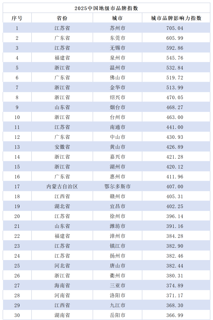 2025全国地级市品牌指数前30位城市